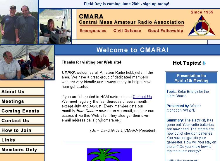 CMARA This Web site, created for the Central Mass Amateur Radio Association (CMARA), swaps out 3 members' pictures upon every page load giving the impression of a fresh look each time a page is visited or loaded. The site has a news scroller, sound and a password-protected section for members only. The Web site was created within a 48-hour period and much to the satisfaction of our client. |