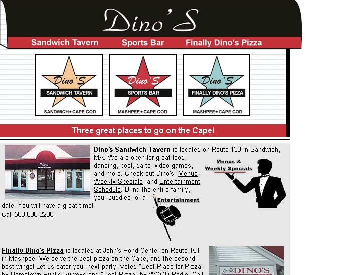 Dino's Restaurants Dino's wanted one well-organized Web site to encompass all three of their popular restaurants on the Cape. |