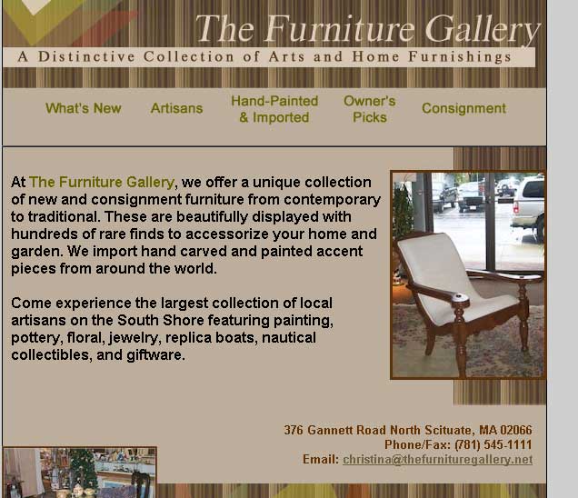 Furniture Gallery This furniture/arts and crafts store needed a Web site that presents its many merchandise categories in a well-organized and attractive manner. |