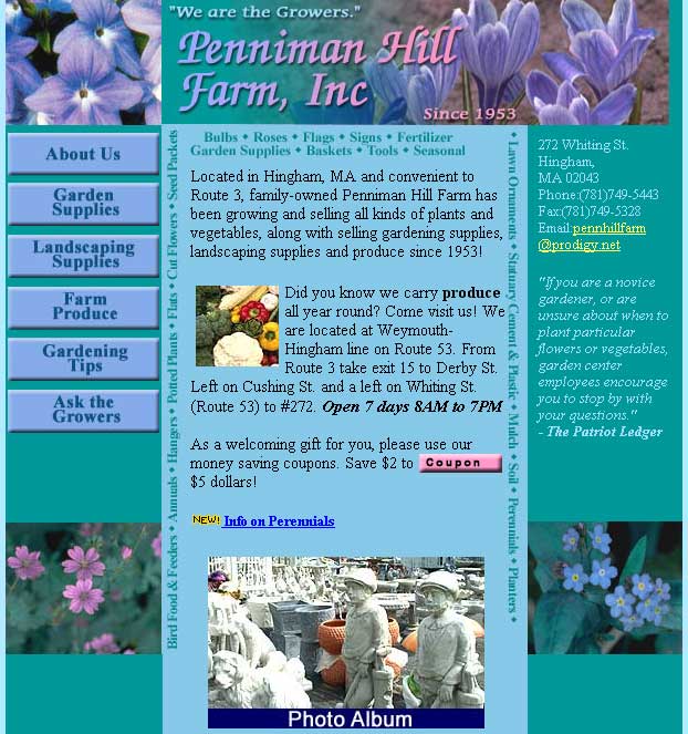 Penniman Hill Farm This client wanted to provide people with a Web "brochure" along with their own farming and gardening tips. Their online form encourages people to ask them questions -- a great marketing tactic! |