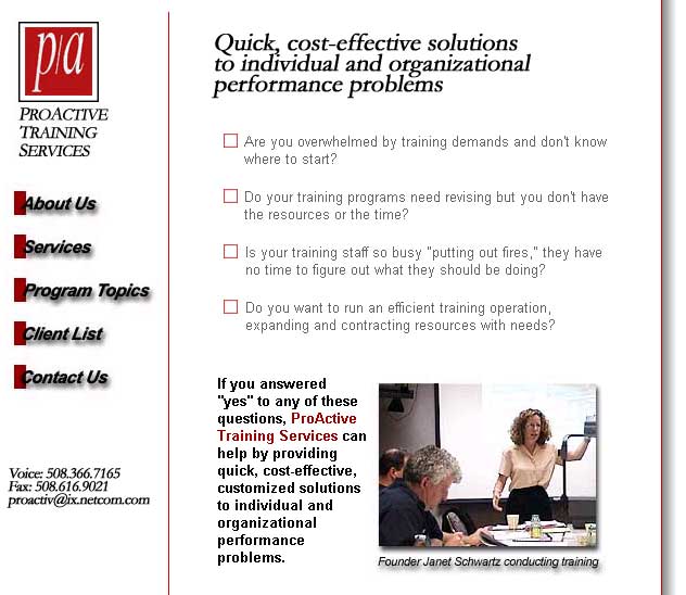 ProActiveTraining Services This business services company required a Web site that would provide them with a professional corporate presence on the Web. |