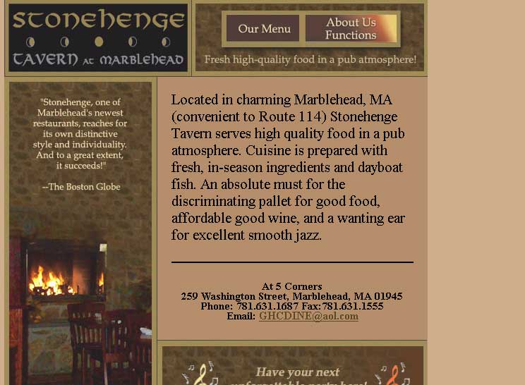 Stonehenge Restaurant This client wanted us to capture the quaint "tavern" feel of his restaurant. This site provides viewers with general info, along with the Tavern's main menus. |